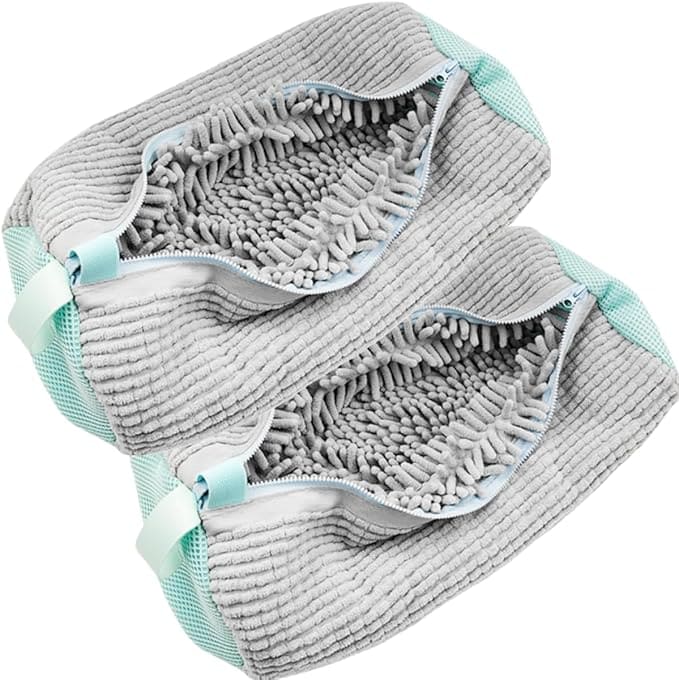 The Compacta Home™ shoe wash bags are made from durable, breathable chenille microfiber fabric (10,000+ fibers, each 3 cm long). Water and detergent flow through easily while the soft chenille gently scrubs your shoes in the washing machine – protecting them from scratches and wear.